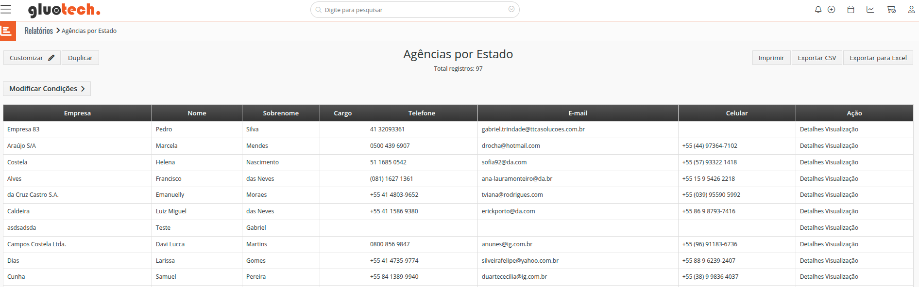 Clique sobre o botão Gerar Relatório, para que seu Relatório seja apresentado. Uma vez gerado, o relatório poderá ser impresso, conforme se apresenta na tela, ser exportado em Excel ou CSV, customizado, para realizar algum tipo de ajuste que julgar necessário, ou ainda duplicado, conforme indicado em destaque na Figura 06 - Relatório Gerado, abaixo: