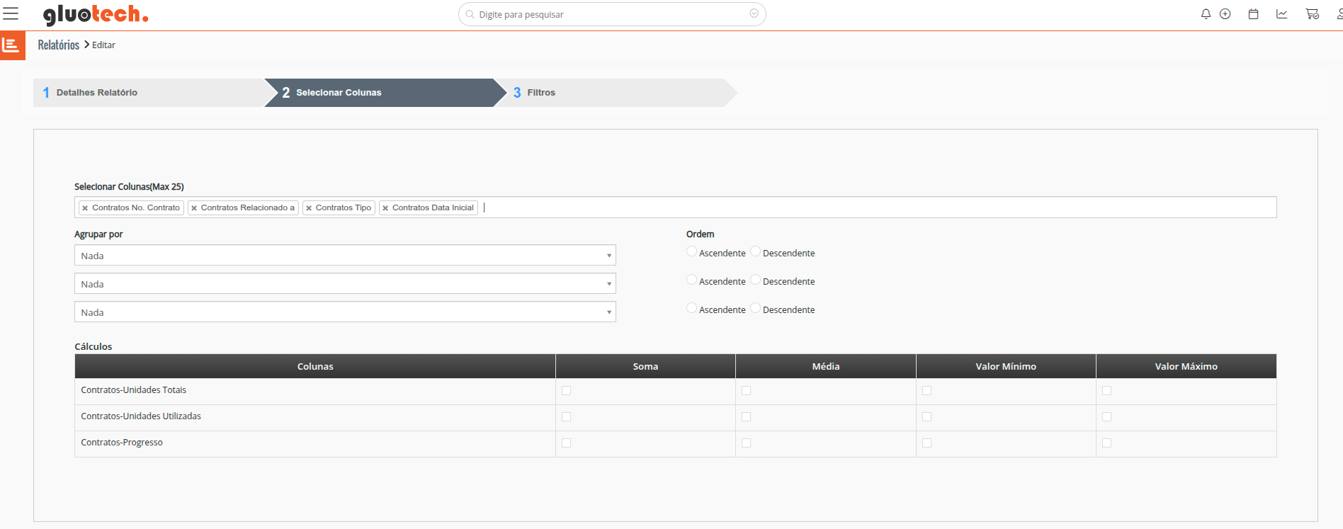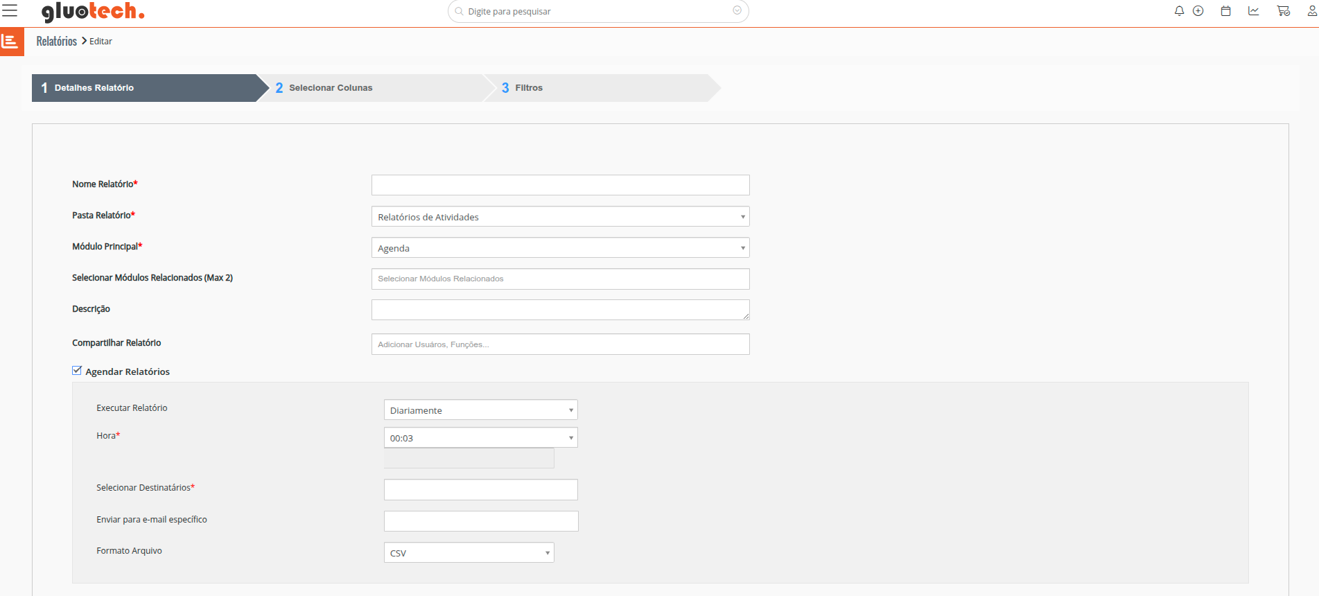 Para criar uma relatório no Gluo CRM você deverá passar por 3 estágios: Detalhes Relatório, Selecionar Colunas e Filtros. Vamos explicar, logo abaixo, como você deve proceder gerar seus relatórios.