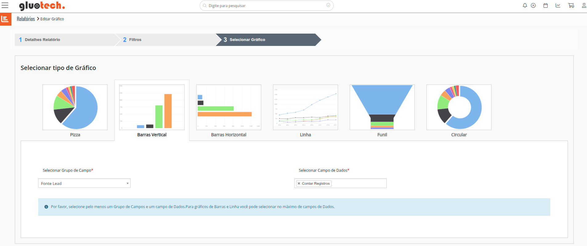 1 | Selecione o tipo de gráfico que deseja utilizar para exibir os dados: Pizza, Barras Vertical, Barras Horizontal, Linha, Funil ou Circular. |
