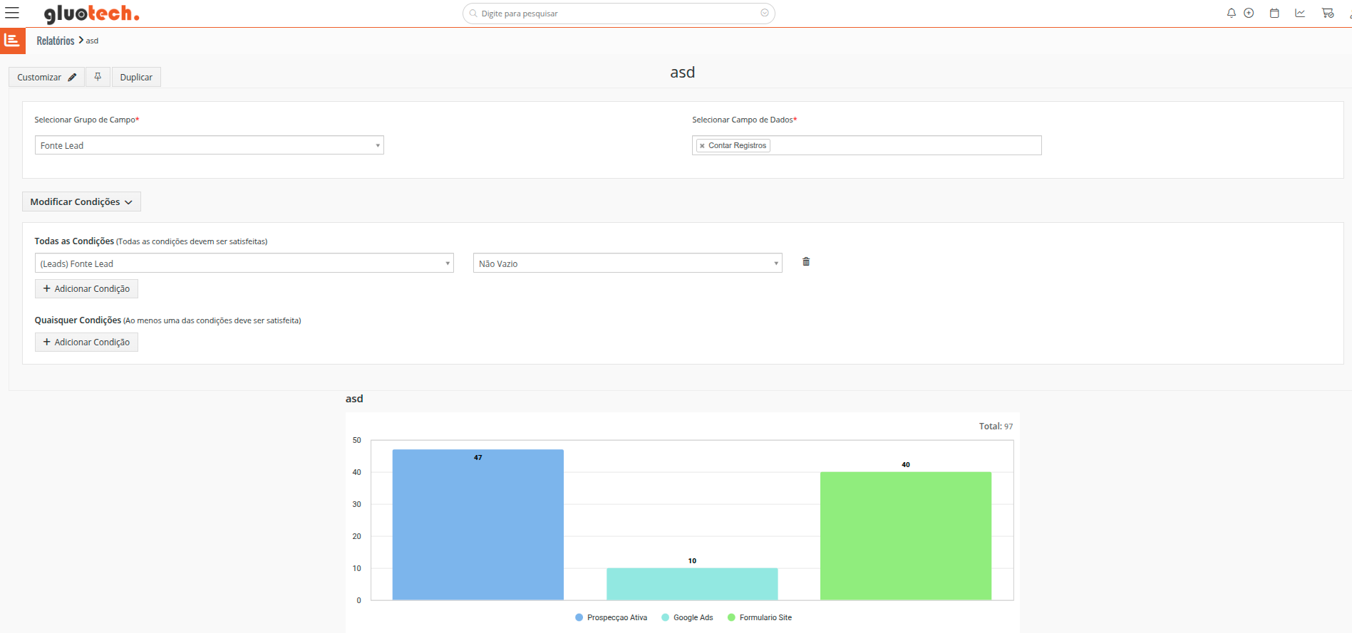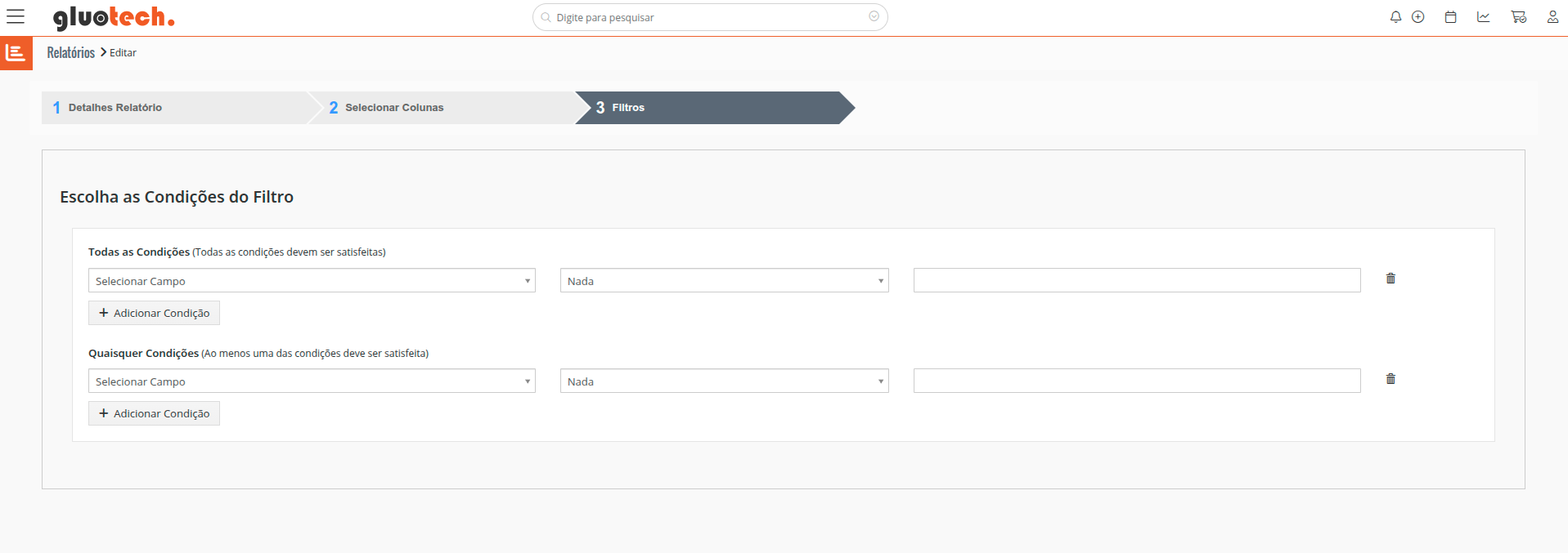Na terceira e última etapa do processo de criação de relatórios no Gluo CRM, é disponibilizada a opção de definição das condições ou critérios para geração dos dados esperados. Neste momento você pode determinar as condições obrigatórias e/ou complementares para gerar o relatório.