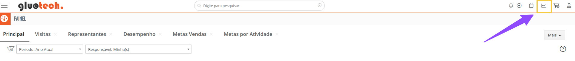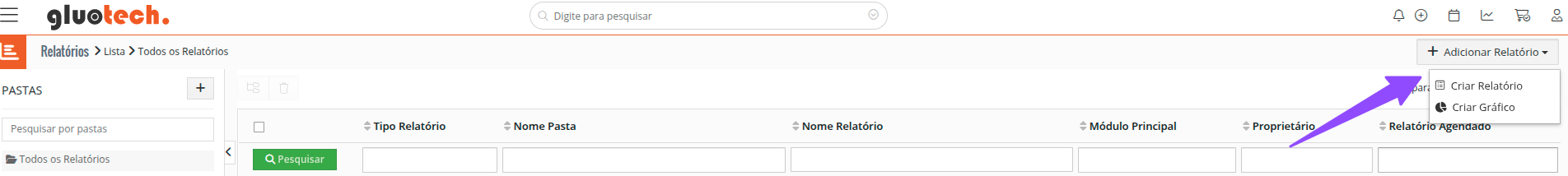 Por padrão, o Gluo CRM apresenta uma série de relatórios pré-definidos, contudo, você tem total liberdade para criar os seus próprios relatórios e gráficos. Para criar seus relatórios e gráficos, acesse a partir do ícone , localizado no topo, a direita da tela, a área de criação, conforme a Figura 01 - Acessando Área de Criação de Relatórios e Gráficos, abaixo: