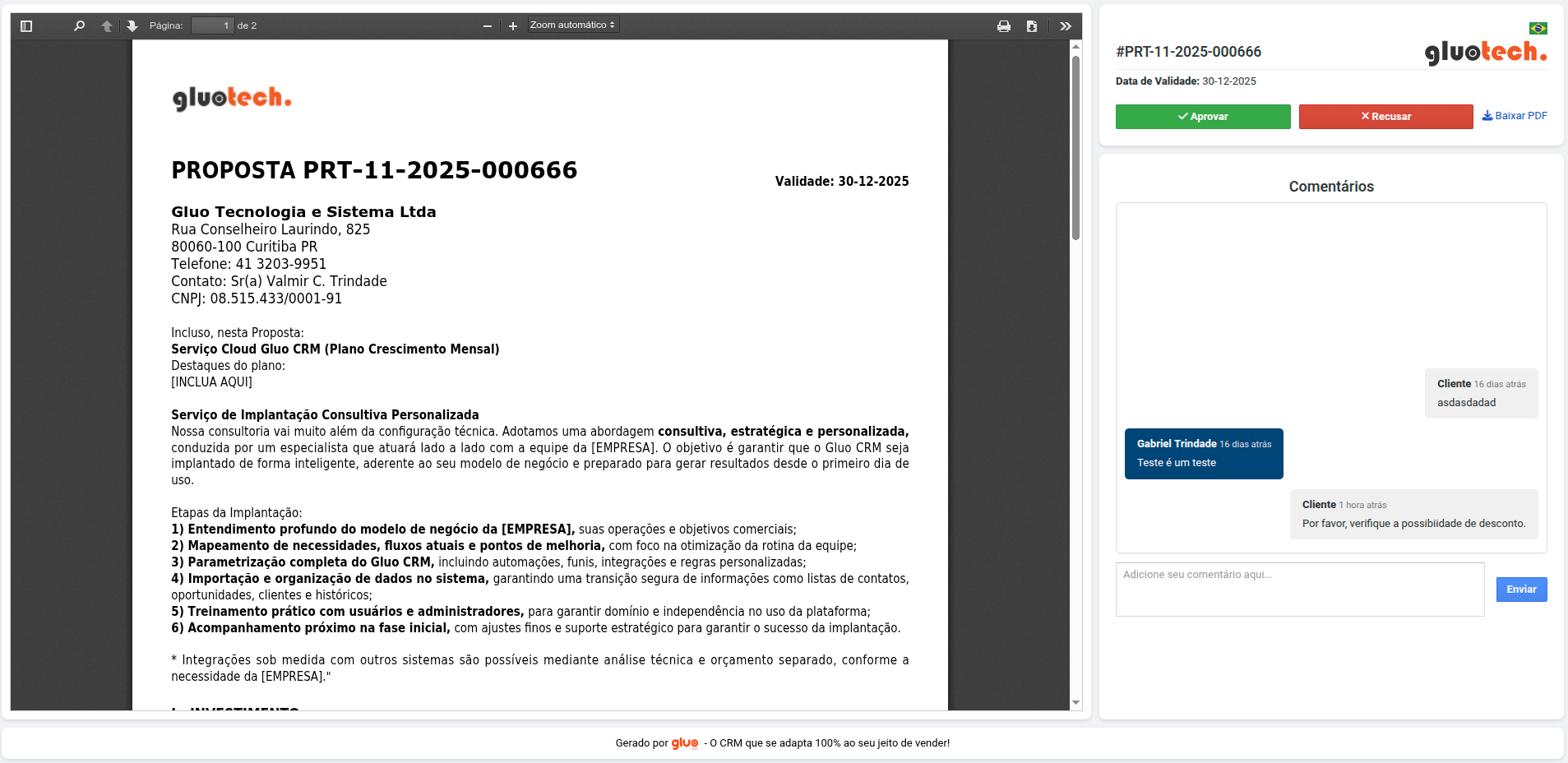 A partir da proposta gerada no CRM, clique em Exportar PDF > Copiar link de aprovação. Envie o link para o cliente a por e-mail ou WhatsApp.