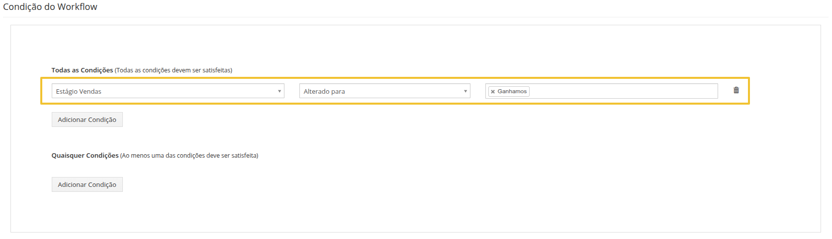 Neste bloco você deve definir as condições necessárias para executar o Workflow. Para o caso do exemplo definido no início deste post, basta configurar conforme Figura 05 - Condições do Workflow.