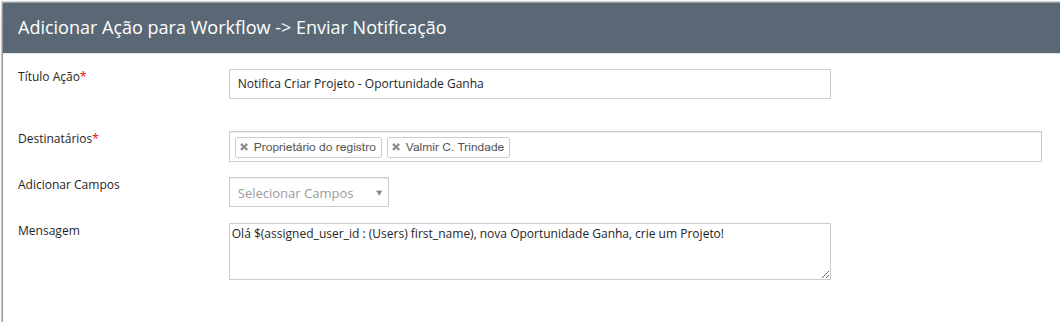 A título de exemplo, considere a seguinte situação hipotética: "assuma que você deseja que determinado usuário do CRM receba uma notificação assim que uma Oportunidade for dada como "Ganha" e que seja orientado a criar um Projeto."