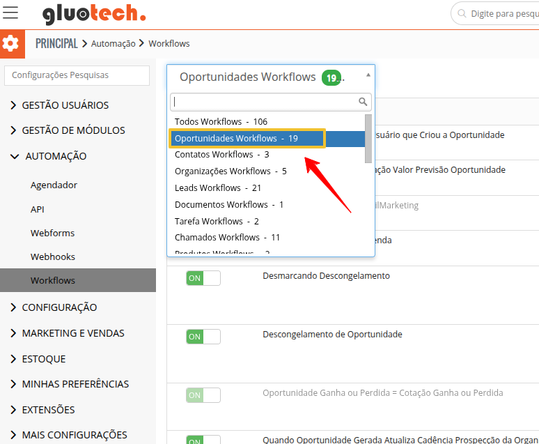 - Como Administrador do CRM, acesse a área de Workflows a partir do menu Configurações > Automação > Workflows e selecione Oportunidades Workflows: