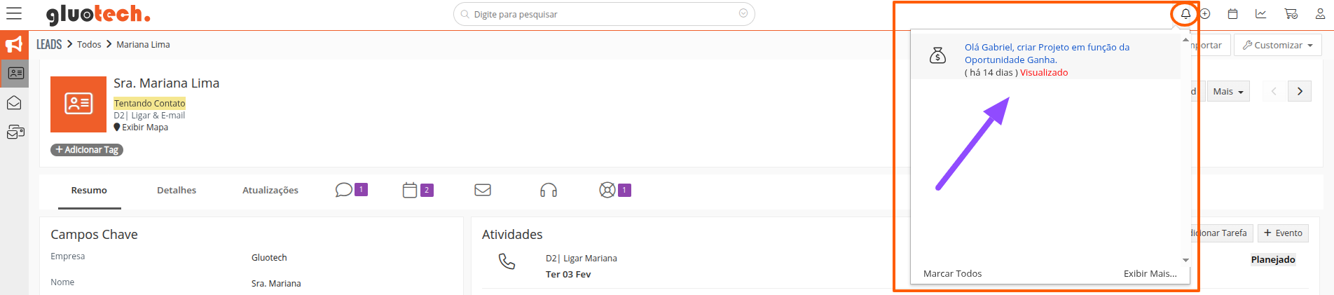 Assim que a condição do Workflow for atendida, a notificação será exibida para o destinatário com link para acesso ao cadastro relacionado (no caso do exemplo, módulo de Oportunidades).