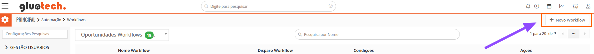 - Clique sobre Oportunidades Workflows, conforme indicado na imagem acima e na sequência em Novo Workflow:
