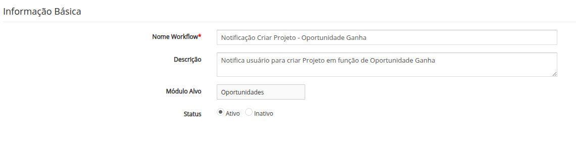 Dê um nome resumido para o Workflow que represente a ação que ele deverá executar e no campo Descrição expliqu com mais detalhe sobre a ação que do Workflow.
